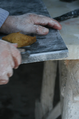 No Largo do Mastro, um dos últimos marmoristas de Lisboa. Trabalham aí três homens. Até quando? Lá dentro, há muito pó branco. Mesmo muito. O barulho é ensurdecedor. Cortar placas de mármore faz barulho. E pó, muito pó. Não vamos entrar na questão de saber até que ponto estas pequenas indústrias devem estar aqui. Mas, enquanto aqui estão, pois em breve vão desaparecer, nós gostamos de as mostrar aos mais distraídos - porque uma cidade também é isto. Enquanto houver lápides funerárias nas campas ou enquanto quem quiser homenagear o Dr. Sousa Martins, cuja estátua fica por perto, estes homens continuarão a trabalhar.